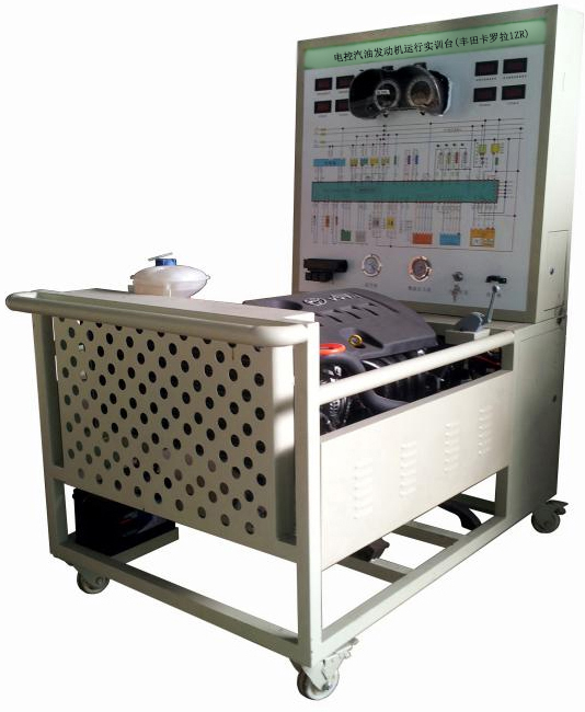該設備采用翻新豐田卡羅拉1ZR電控汽油發(fā)動機總成及運行附件的固定臺架和運行檢測控制面板臺架兩部分組成。