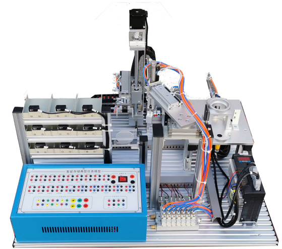模型底板由10mm厚鋁板加工氧化而成,模型由堆垛機、立體倉庫、搬運機械手、稱重加料機構(gòu)、傳感器、氣缸等組成;所有機構(gòu)由有1.2mm優(yōu)質(zhì)鋼板加工噴涂制作或鋁材機加氧化而成,堅固耐用。該任務(wù)堆垛機有步進與伺服控制,負責物料的出入倉;機械手負責對物料的加料前后的搬運;稱重加料機構(gòu)對物料進行稱重及加料工作。同時為方便教學,開發(fā)了全開放的任務(wù)接口盒,盒體由1.2mm優(yōu)質(zhì)鋼板加工噴涂制作,面板有鋁板噴涂蝕印沖孔而成,通過并口電纜與智能存儲任務(wù)模型連接,以迭插端子形式開放模型接口,方便實訓教學。