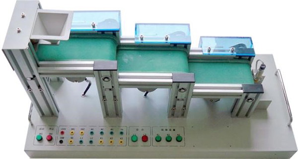 模型主要由漏斗上料裝置、三級傳送帶、直流電機、電磁鐵、電容傳感器、開關、指示燈、鋁型材框架、安裝底板、手柄等組成,通過PLC編程,可完成自動送料裝車系統(tǒng)的模擬控制。 |