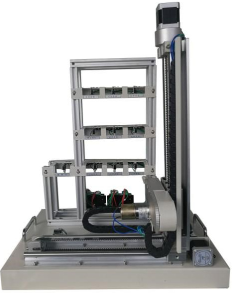 模型包含三層九倉位庫體、出/入庫倉位庫體、三維(X、Y、Z)運動機械及電氣控制等部分組成;定位執(zhí)行機構由豎軸和橫軸組成;驅動機構由步進電機及步進電機驅動器組成;傳動軸為滾珠絲桿傳動和雙軸導軌帶傳動,傳動平穩(wěn)。取物軸由直流減速電機驅動,可實現(xiàn)前后兩方向的運動。 |