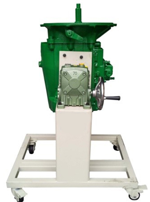 1.采用翻新天錦EQ1120GA2 8JS125TA型手動(dòng)變速器總成(附件齊全,易于拆裝),并裝在專(zhuān)用翻轉(zhuǎn)架上。 采用減速翻轉(zhuǎn)機(jī)構(gòu),可使變速器旋轉(zhuǎn)任意角度,并能任意位置鎖止,便于學(xué)生從不同的角度進(jìn)行拆卸和裝配。
