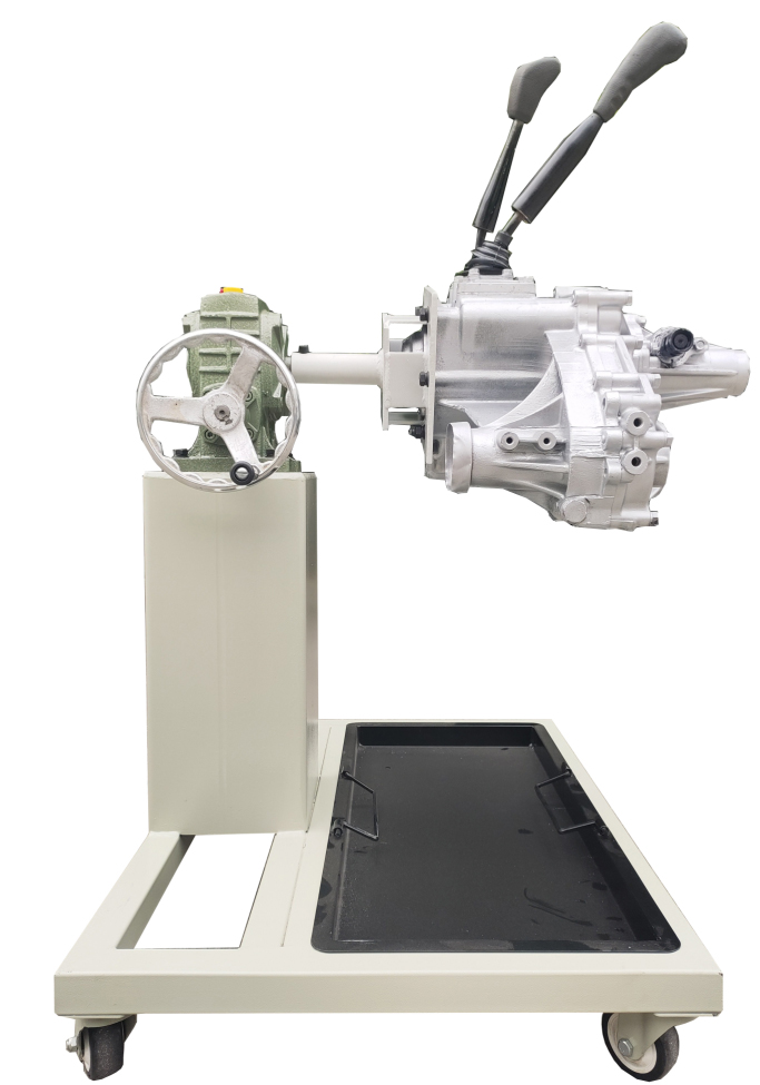 采用減速翻轉(zhuǎn)機(jī)構(gòu),可使分動箱旋轉(zhuǎn)任意角度,并能任意位置鎖止,便于學(xué)生從不同的角度進(jìn)行拆卸和裝配。