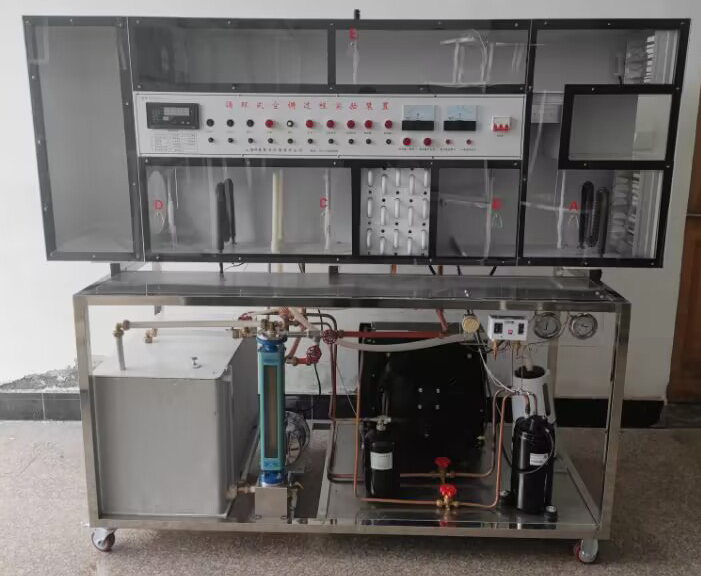空氣熱濕處理實(shí)驗(yàn)裝置為《空氣調(diào)節(jié)》課程實(shí)驗(yàn)教學(xué)設(shè)備,用它可以模擬不同季節(jié)室內(nèi)和室外的環(huán)境和空氣處理調(diào)節(jié)的方法,進(jìn) 行集中式空調(diào)系統(tǒng)不同循環(huán)形式的空氣調(diào)節(jié)實(shí)驗(yàn)。還可以 做變風(fēng)量運(yùn)行調(diào)節(jié)實(shí)驗(yàn)和制冷系統(tǒng)的參數(shù)測(cè)定及其調(diào)節(jié)實(shí)驗(yàn)。裝置具有透明風(fēng)管,可直觀地觀察和測(cè)試。實(shí)驗(yàn)裝置的 結(jié)構(gòu)由空氣循環(huán)系統(tǒng)、加濕器、加熱器、冷卻器及其冷水 機(jī)組和相應(yīng)的測(cè)試儀表等組成?梢詫(shí)現(xiàn)對(duì)空氣的加熱、冷卻、加濕和除濕(表冷式和淋水式可互換使用)等處理。 在實(shí)驗(yàn)中,還可以對(duì)空氣的溫度、濕度、流量進(jìn)行測(cè)量,并 能對(duì)加溫器、加熱器的輸入電功率進(jìn)行測(cè)定,從而可以計(jì)算各空氣處理過程中的熱量和濕量得失,以及進(jìn)行熱、濕平衡 的分析。