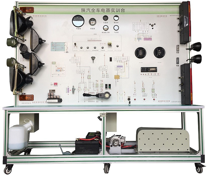 全車(chē)電器電路實(shí)訓(xùn)設(shè)備采用陜汽SX2220柴油機(jī)整車(chē)電器實(shí)物為基礎(chǔ),充分展示汽車(chē)儀表系統(tǒng)、燈光系統(tǒng)、雨刮系統(tǒng)、喇叭系統(tǒng)、發(fā)動(dòng)機(jī)電器系統(tǒng)、起動(dòng)系統(tǒng)和充電系統(tǒng)等汽車(chē)電器各系統(tǒng)的組成結(jié)構(gòu)和工作過(guò)程。