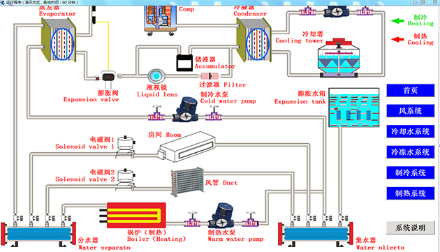 7、中央空調(diào)虛擬仿真演示系統(tǒng)"是基于動(dòng)畫模式,客戶端采用計(jì)算機(jī)虛擬仿真技術(shù),以FLASH動(dòng)畫的形式來(lái)仿真中央空調(diào)的工作流程(包括正常工作流程和故障工作流程)、故障產(chǎn)生過(guò)程現(xiàn)象、故障排除過(guò)程現(xiàn)象。軟件中有主要有三部分組成: