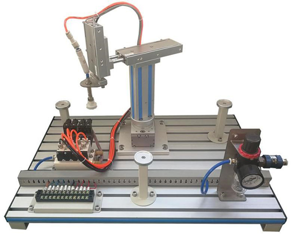 模型由回轉氣缸、雙軸氣缸、單軸氣缸、吸盤、真空發(fā)生器、電磁閥、節(jié)流閥、手滑閥、減壓閥、磁性開關、機械部件、工業(yè)鋁合金型材底板等組成,設有兩個抓取工位,可進行工件取放控制練習?砷_展對氣動機械手的操作及編程控制訓練。配有空氣壓縮機:靜音無油,工作電源AC220V±10% 50Hz,輸入功率0.68kW;公稱容積24L,理論流量:116L/min,額定輸出氣壓0.7MPa。