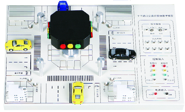模型以實際十字路口按一定的比例微縮而成,配有道路模型、交通指揮燈、電氣控制接口區(qū)域等。具有指示和控制、啟/停按鈕、手/自動按鈕、行人呼叫按鈕、四方向紅/黃/綠燈指示等功能。
