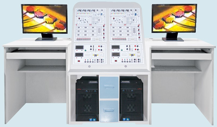 雙工位同步教學平臺:尺寸:800×600×1200mm 材質:ABS 厚度5毫米,平臺后部采用透明有機玻璃;平臺下端兩側擺放電腦主機,主機中間另有兩個抽屜存放實驗器材,平臺上部擺放2個工位的數(shù)/模電同步互動教學系統(tǒng)硬件模塊。 |