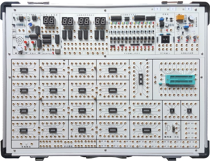 數(shù)字電路實驗箱,數(shù)字電路實驗室,數(shù)字邏輯實驗箱、數(shù)字電路實驗裝置、主要用于開設(shè)電子信息科學(xué)與技術(shù)、自動化和機(jī)電一體化三個專業(yè)的《數(shù)字電子技術(shù)實驗》或《數(shù)字電子技術(shù)基礎(chǔ)實驗》課程,該課程是相應(yīng)的《數(shù)字電子技術(shù)》或《數(shù)字電子技術(shù)基礎(chǔ)》理論課程中重要的實踐環(huán)節(jié)。課程的任務(wù)是通過實驗,使學(xué)生加深對所學(xué)理論課程內(nèi)容的理解,激發(fā)學(xué)習(xí)興趣,從實踐上驗證所學(xué)的理論知識;培養(yǎng)學(xué)生的實際動手能力、解決問題能力和設(shè)計數(shù)字電子電路的初步能力。數(shù)字電路實驗箱由鋁木合金箱體、開關(guān)電源、常用信號源和實驗電路區(qū)組成。其中實驗電路區(qū)采用全開放模式,可根據(jù)需求靈活配置實驗電路,以滿足不同層次學(xué)生的教學(xué)實驗要求。