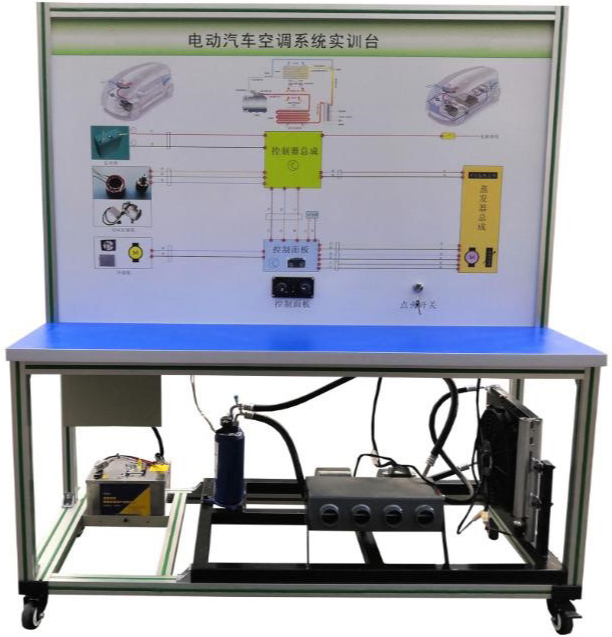 點(diǎn)火開(kāi)關(guān)、電動(dòng)汽車(chē)空調(diào)壓縮機(jī)、膨脹閥總成、干燥器總成、鼓風(fēng)機(jī)總成、冷凝器、冷卻電子風(fēng)扇、電動(dòng)空調(diào)壓縮機(jī)控制器總成、空調(diào)蒸發(fā)箱總成、充電器與充電接口、充電插線、DC-DC轉(zhuǎn)換器、鋰電池組、空調(diào)操作面板、高低壓空調(diào)壓力表、采暖模塊總成、電源總開(kāi)關(guān)、急停開(kāi)關(guān)、直流接觸器、輔助蓄電池(12V45AH)、一體化全鋁合金型材搭建的移動(dòng)臺(tái)架(1500×700×1700mm 帶自鎖腳輪裝置,帶安裝檢測(cè)端子的原理面板,面板1448×940mm)、故障模擬與排除裝置、設(shè)備操作說(shuō)明書(shū)。