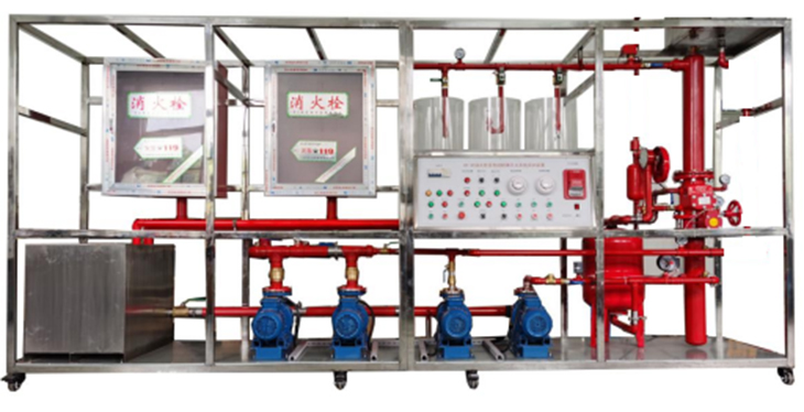 模型框架和水箱等主要部件全部使用不銹鋼器件,保證不生銹、不易老化,模擬大樓噴淋滅火系統(tǒng);模型系統(tǒng)主要由噴淋水泵、氣壓罐、濕式報警閥、水力警鈴、延時器、壓力開關(guān)、水流指示器、封閉式噴頭、試驗閥、火災探測器、火災報警器等典型噴水滅火設備構(gòu)成,能生動模擬大樓內(nèi)水滅火系統(tǒng)的典型結(jié)構(gòu)。